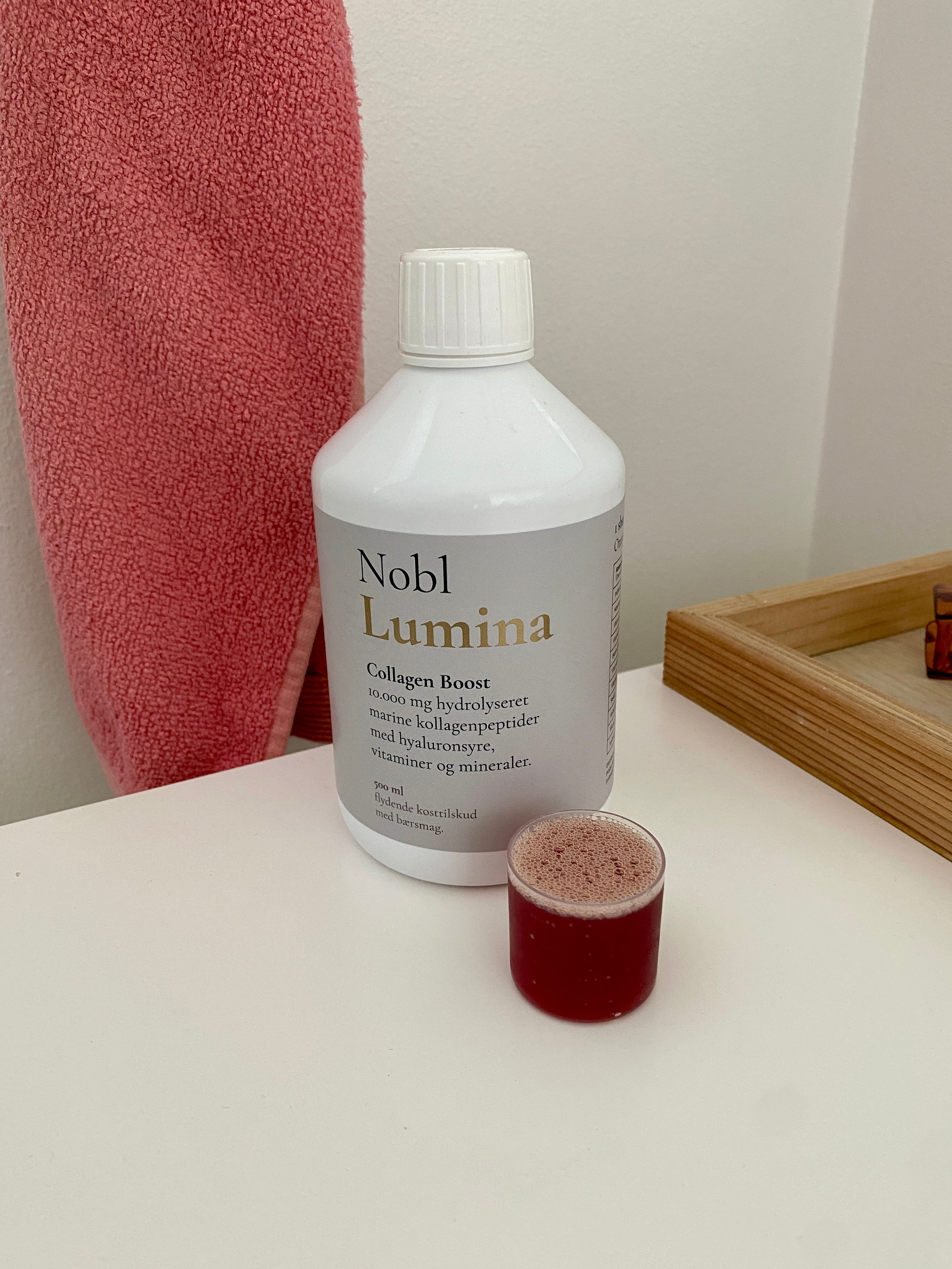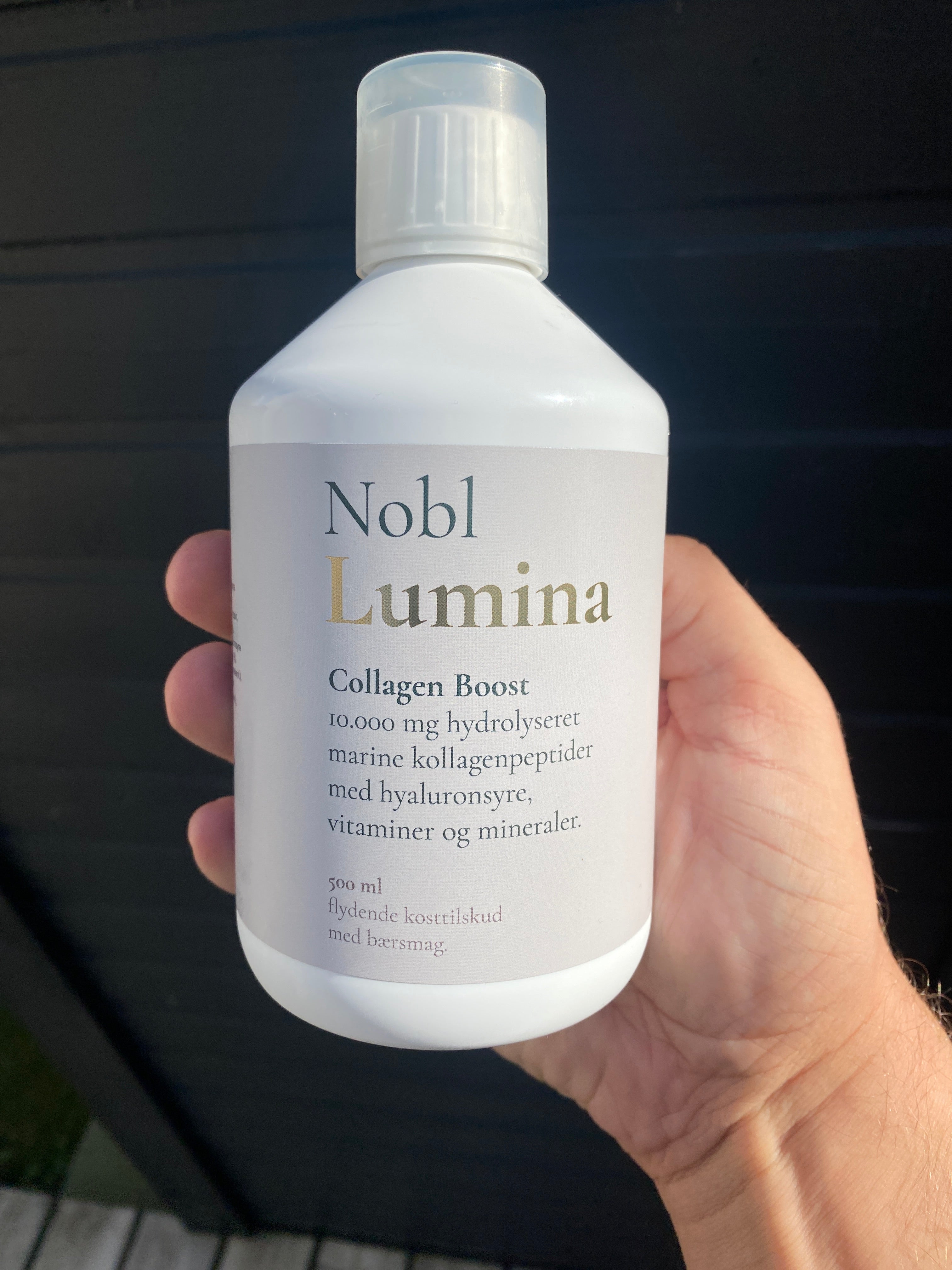 Nobl Lumina er et flydende dagligt shot med 10.000 mg hydrolyseret marine kollagen (type I & III), kombineret med hyaluronsyre, vitaminer og mineraler: